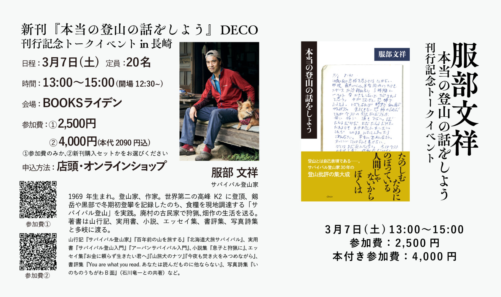 新刊「本当の登山の話しをしよう」の発売に合わせて、ついに服部氏が長崎にやってきます。場所は長崎市出島町にて、広さ40平米の店内で新刊書籍と古本、カフェが楽しめるBOOKSライデンさん。服部氏の話を聞くにはピッタリの場所なのではないでしょうか。